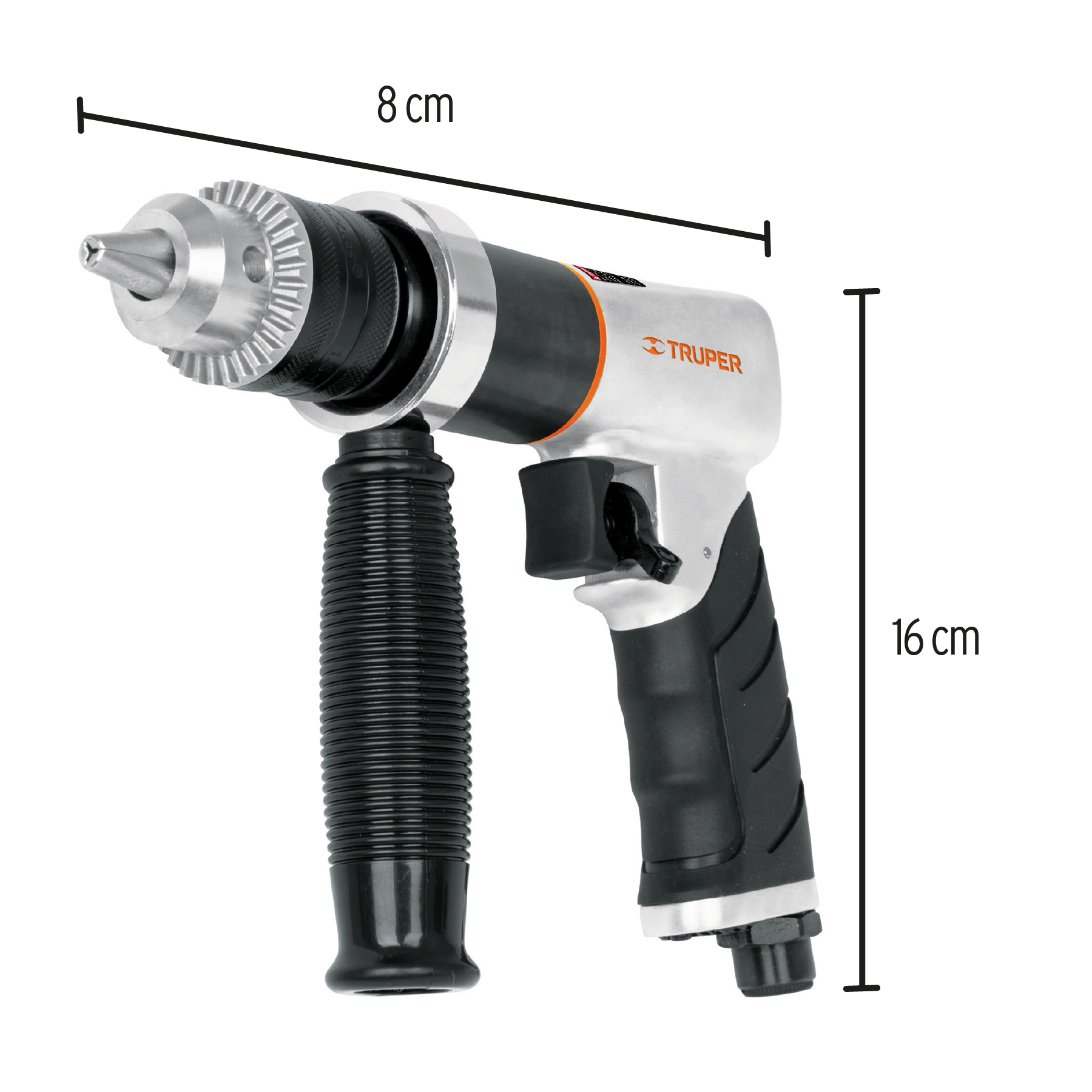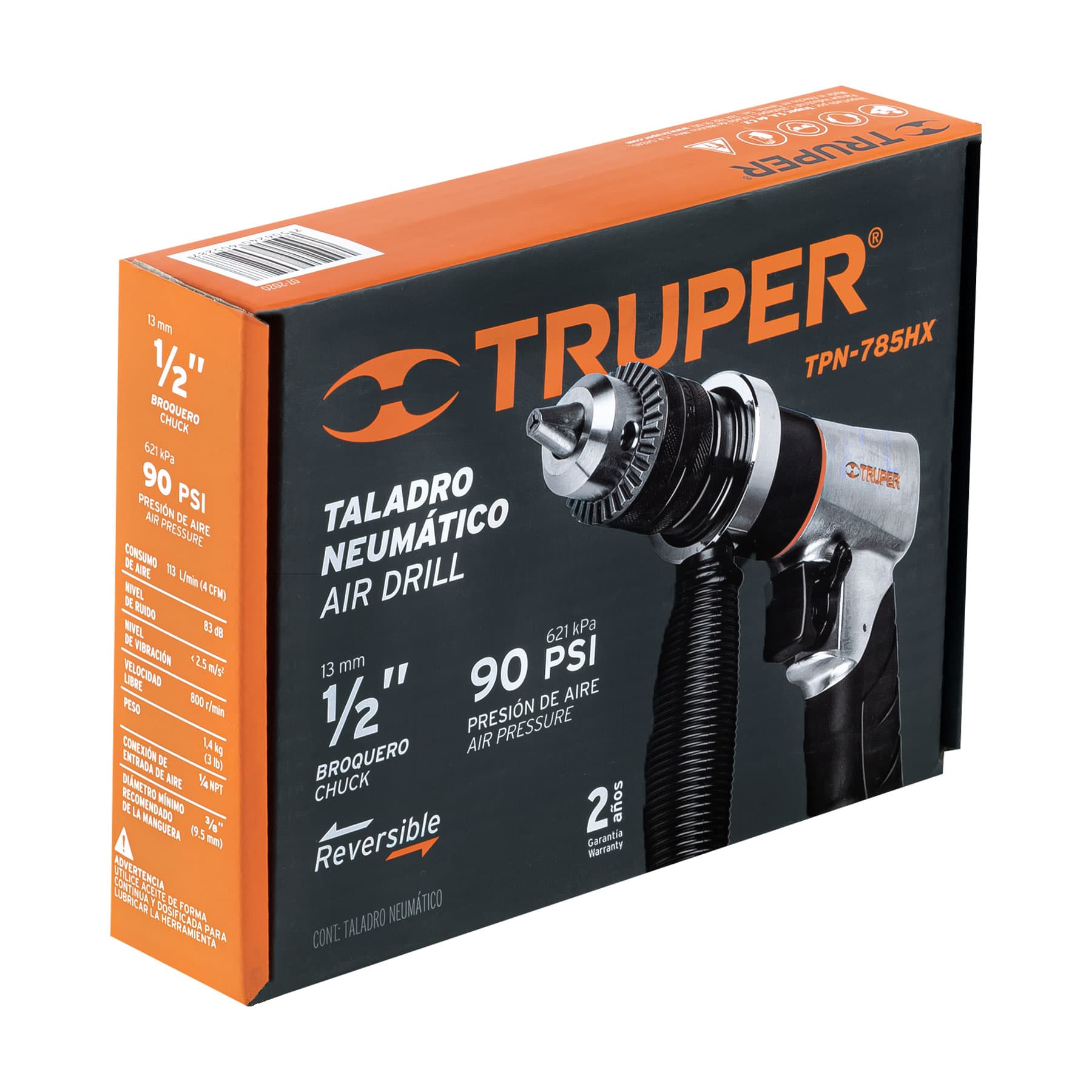 Broquero: 1/2" Velocidad: 0 - 800 rpm Consumo nominal: 4 CFM a 90 psi Conexión de entrada de aire: 1/4" NPT Diámetro interno de la manguera. 3/8" (10 mm) Desalojo de aire: Inferior Dimensiones (Alto x largo): 16 x 21 cm Ciclo de trabajo: Continuo (Lubrique constantemente) Peso: 1.4 kg Empaque individual: Caja Inner: 1 Master: 4