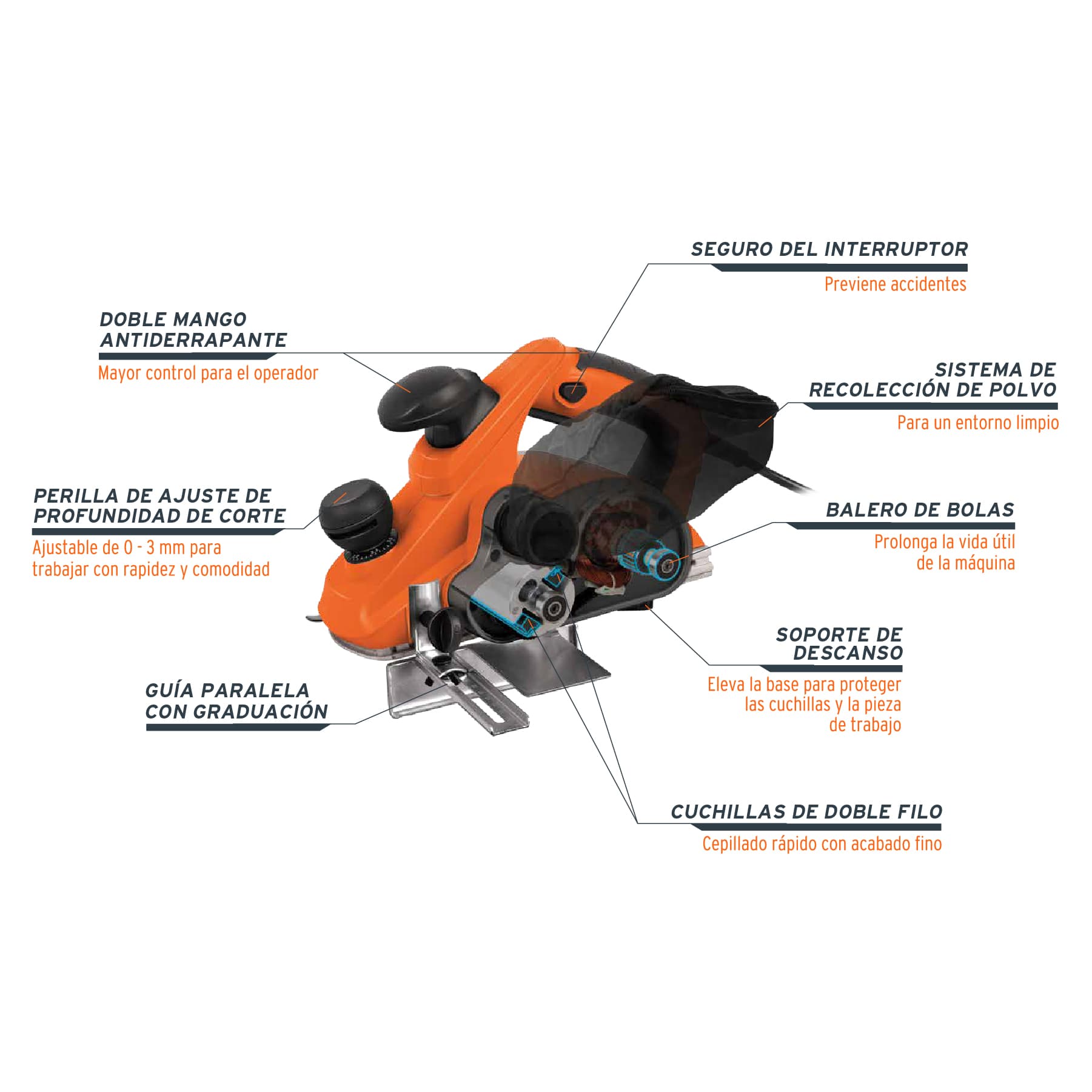 Potencia: 850 W Tensión / Frecuencia: 127 V / 60 Hz Consumo: 6.7 A Velocidad: 16,000 rpm Ancho de corte: 3 1/4" (83 mm) Profundidad de cepillado: 3 mm Ciclo de trabajo: 30 minutos de trabajo por 15 minutos de descanso. Máximo diario 3 horas Peso: 3 kg Empaque individual: Caja